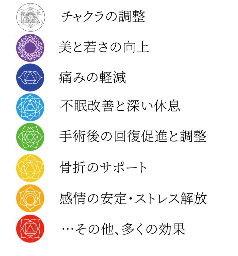 エネルギーフィールドを流れる光と音を用いて経絡・チャクラ・オーラなどの微細なエネルギーシステムを整え、ブロックを解放し、細胞の再生やDNAの活性化を促します。