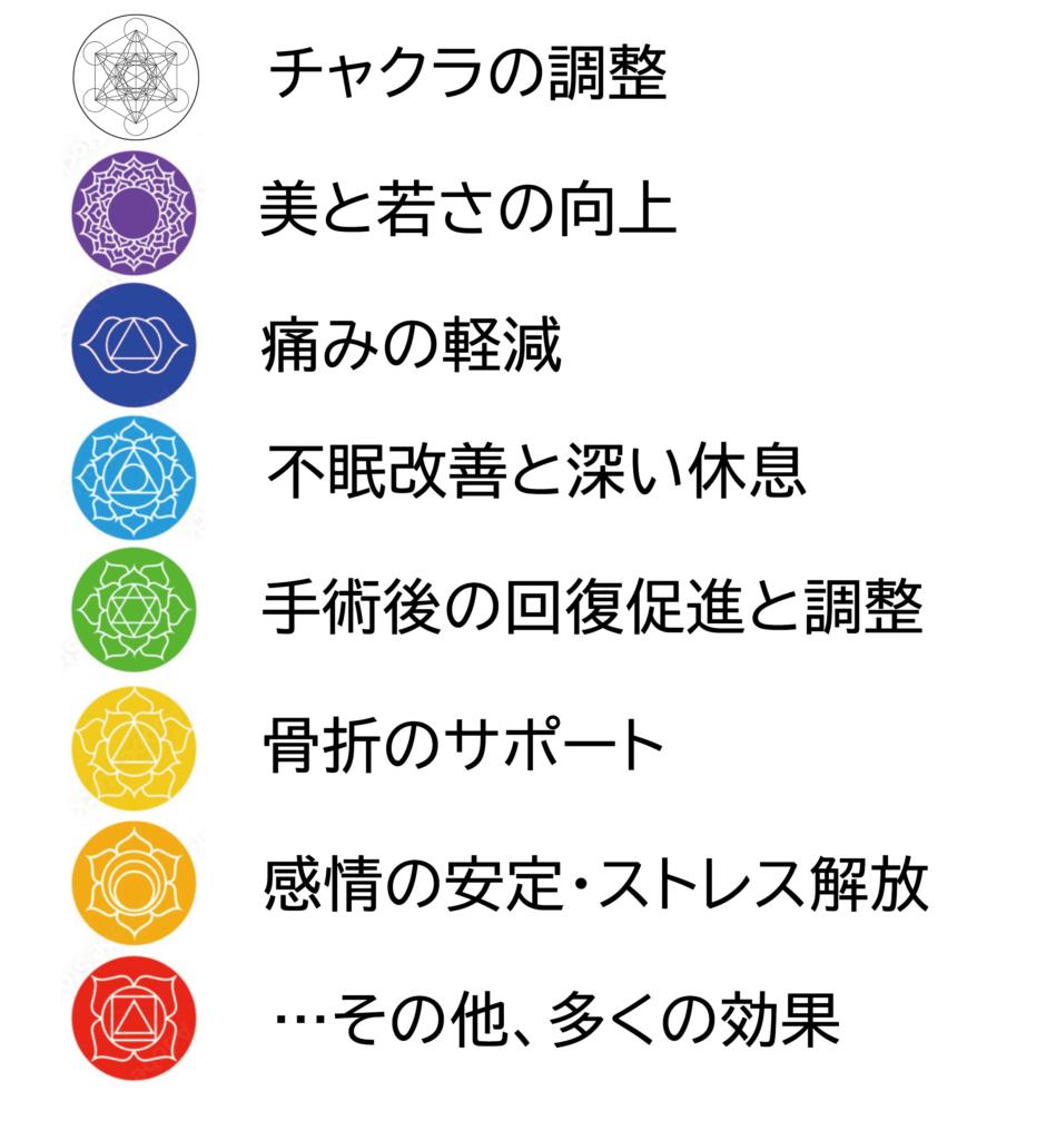 エネルギーフィールドを流れる光と音を用いて経絡・チャクラ・オーラなどの微細なエネルギーシステムを整え、ブロックを解放し、細胞の再生やDNAの活性化を促します。肉体・感情・精神・スピリチュアルのすべての次元において、深く速やかな癒しをもたらします。